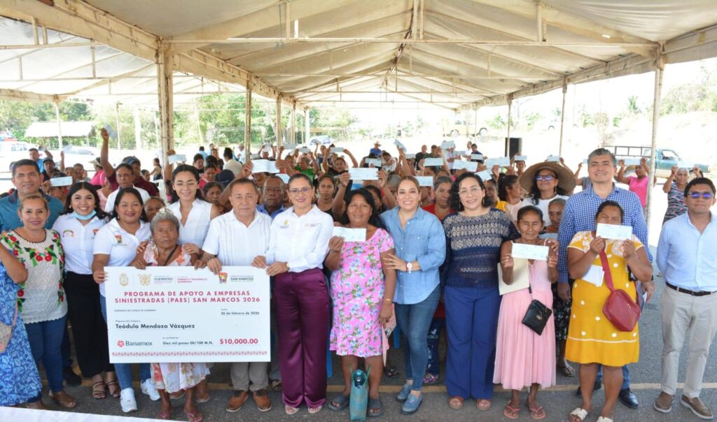 Chilpancingo, febrero 28, 2026.- La secretaria de Secretaría de Fomento y Desarrollo Económico de Guerrero, Teodora Ramírez Vega, entregó los primeros 100 apoyos económicos a comerciantes, restaurantes y artesanos afectados por el sismo del 2 de enero en el municipio de San Marcos, con una inversión inicial de un millón de pesos.
