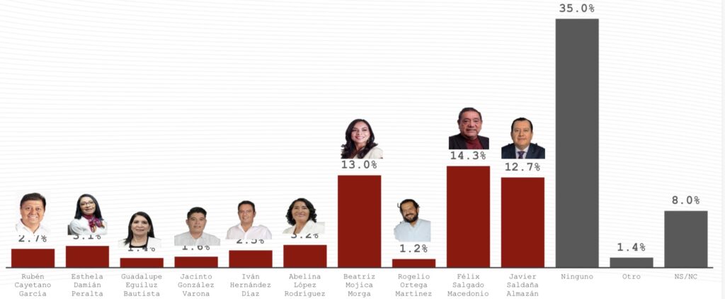 Respecto a las preferencias internas de Morena para la candidatura a la gubernatura, el senador Félix Salgado Macedonio aparece como el perfil mejor posicionado, con el 35% de las menciones.